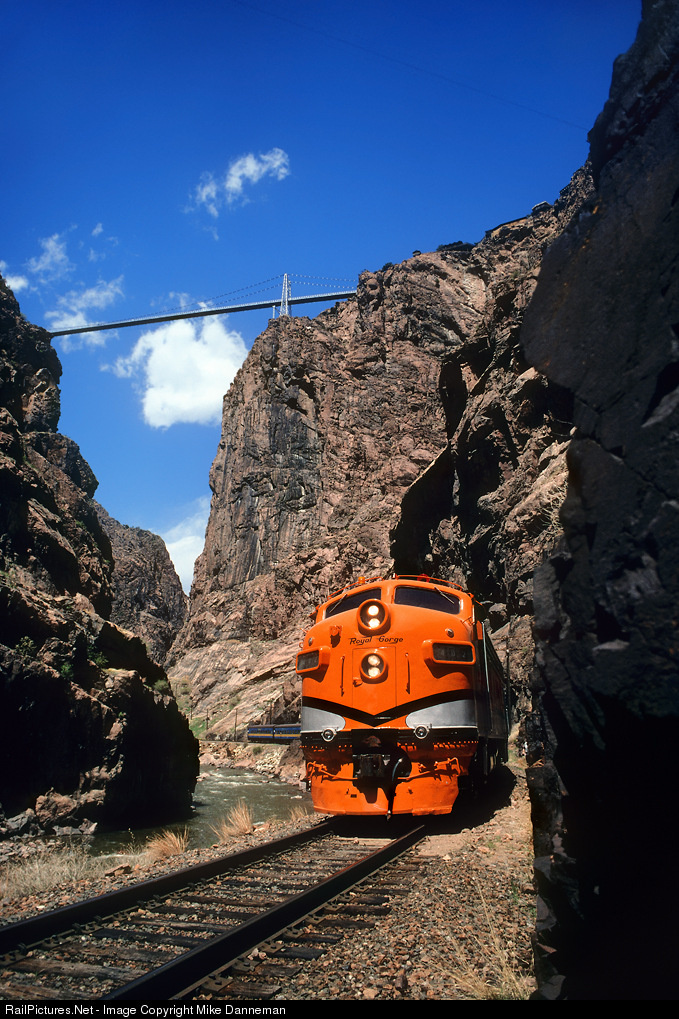 A Royal Gorge Route Railroad (then, Canon City and Royal Gorge) passenger train curves through the depths of Royal Gorge, west of Canon City, Colorado, on May 14, 1999. One of the world's highest suspension bridge which spans the Arkansas River at a height of nearly 1000 feet, soars over the train. This locomotive is former Chicago and North Western Executive F7 No. 402, and lives on today pulling popular excursions through the Royal Gorge.