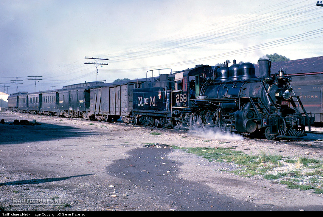 | Narrow gauge National Railways of Mexico Train No. 109 awaits its 7:55 a.m. departure at Puebla, Mexico, bound for Mexico City the long way --- 192 miles taking all day to circle around 17,802-ft. snow-capped Mt. Popocatepetl, through Cuautla and Ozumba. Consolidation 269 was up to the task which turned into about 14 hours. The rear coach with a concrete floor was "first class." |