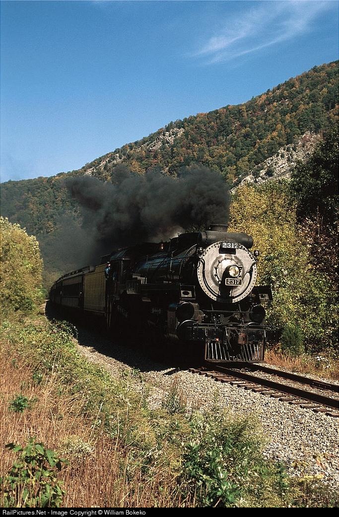 Steamtown, Scranton to Delaware Water Gap, excursion is eastbound on Delaware-Lackawanna RR trackage as it passes Point of Gap, enroute to Slateford Jct. where CP 2317 will run around the train and diesels will be added for the trip back to Scranton.