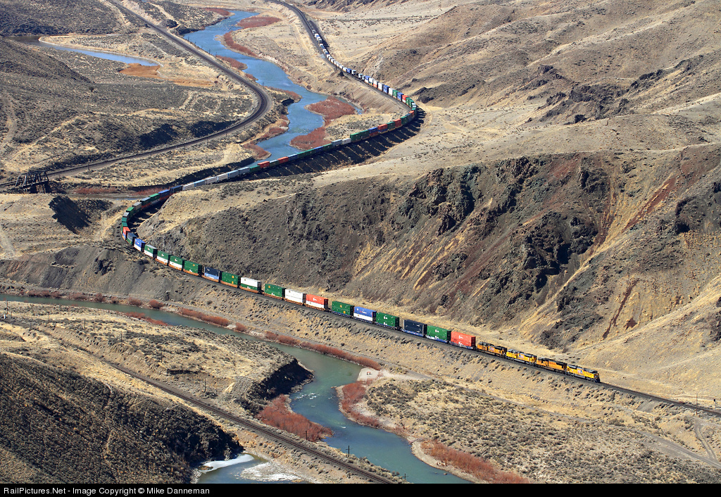 A UP stack train heads eastbound on Track 2 through Palisade Canyon, Nevada, on March 7, 2012. Both Southern Pacific and Western Pacific built their main lines through here alongside the Humbolt River. Now of course, UP owns them both and uses each directionally, giving it a double-track route through this rugged landscape.