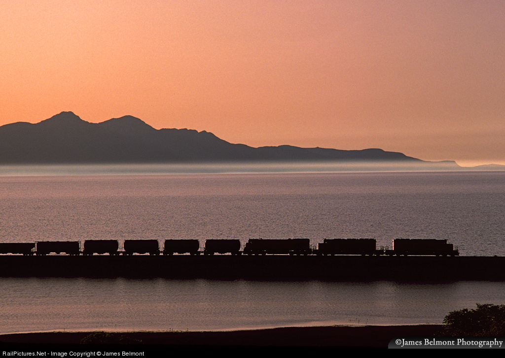 Captured minutes before sunset, Union Pacific's OANP (Oakland, CA - North Platte, NE) skirts the southern shore of the Great Salt Lake on the former Western Pacific. The thin layer of haze is courtesy of nearby MagCorp, Utah's biggest polluter.