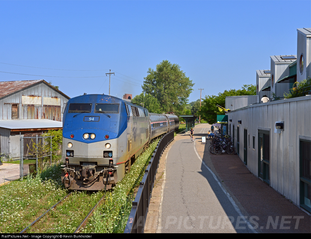 Amtrak's Track Geometry Car / Train spent Tuesday running from St. Albans, VT on to Burlington, VT over the New England Central, then south to Rutland on the Vermont Rail System's proposed Western Corridor Route for future Amtrak service. The train is rolling past the station platform and along the waterfront in Burlington, VT with the Amtrak P42 94 in charge of AmCafe 93348 and the "Corridor Clipper" #10002 Track Geometry Car. (Suffice to say that there will be some weed spraying should this become a regular run...)