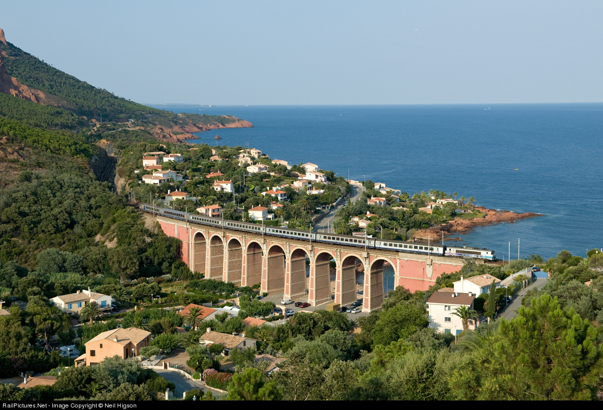 | An unidentified en voyage livered BB22200 pushes the 17:01 Marseille St Charles to Nice Ville (17491) over Anthéor viaduct on 24th July 2012. This stunning location is a stiff 10 minute climb from the campsite in the valley floor. On September 1943 the viaduct attracted the attention of the Lancaster's of 617 (Dambusters) and 619 Squadrons in an attempt to sever the strategic route between southern France and Italy. Little damage was caused to the railway whilst one aircraft was lost but sadly two airmen were killed by defending gunfire |
