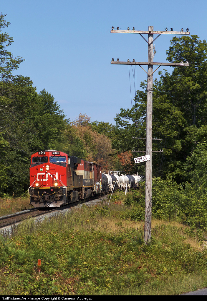 CN M314 heads south horning for Highway 612 and will tone up the foreman at mile 128 of the Bala Sub minutes after its passing. In the background, you can see some trees are already turning. No, this is not an early autumn, the temperatures are still well into the 30's and the sun is still too high. It is merely due to the fact that Ontario had a crappy winter 11 season along with a very dry spring and summer. Those aren't dead leaves, those are dead trees. Forest fire warning levels are at extreme and Ontario has been victim to forest fires at an abnormally severe level. We all be wishin' for rain!