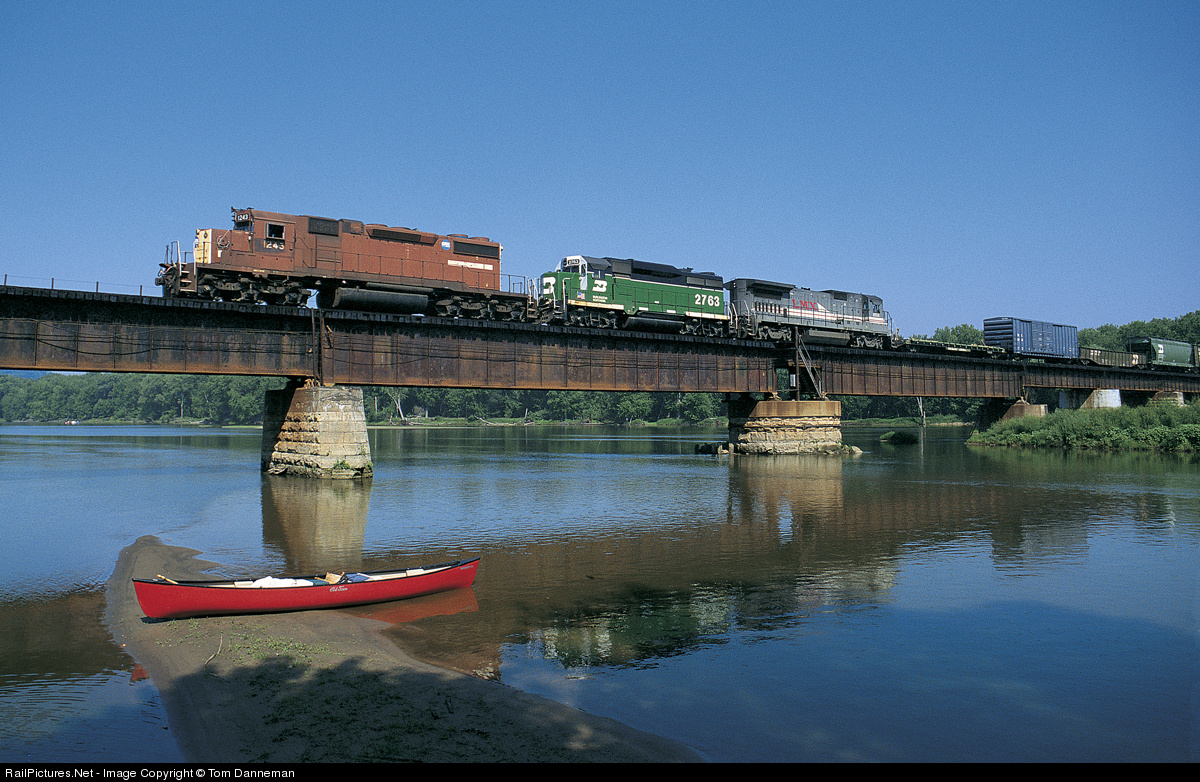 After a long canoe trip down the Wisconsin River, it's time to chill and let the trains come to us. Here an eastbound Burlington Northern freight with a former Reserve Mining SD38-2 on the point, crosses the river just east (south) of Crawford, WI.