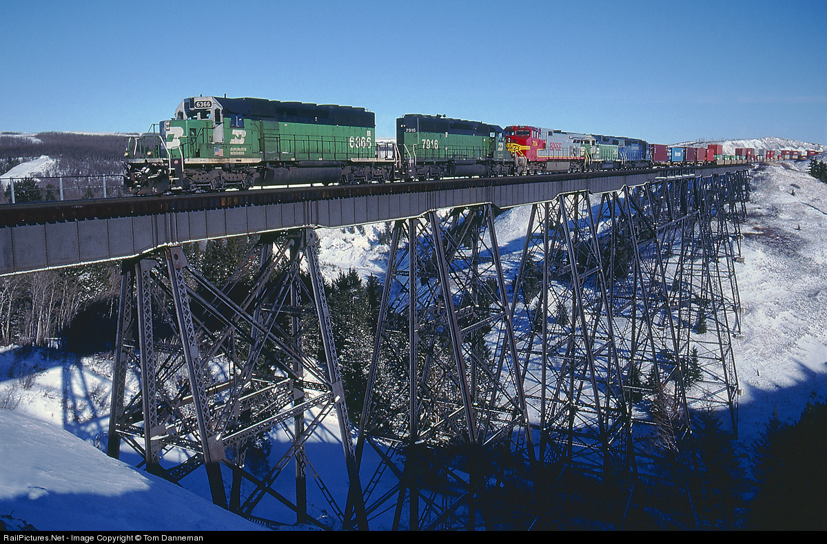 A westbound BNSF intermodal train heads across the spectacular Two Medicine Bridge near East Glacier, Montana, in December 1998. The train is lead by 2 SD40-2s, a Warbonnet Dash 9, a GP38-2, and a leased SD40.