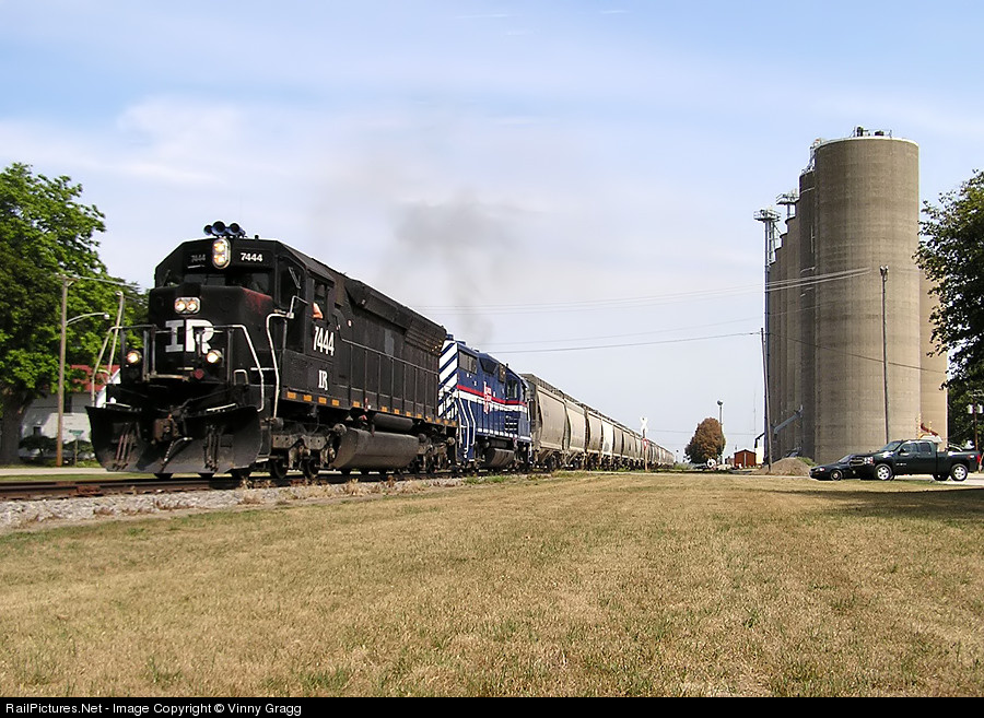 | The Illinois Railway's Job 106 leads 21 cars through the small town of Grand Ridge, bound for Streator. IR 7444 and 3500 provide the power, making for a cool lash-up. |