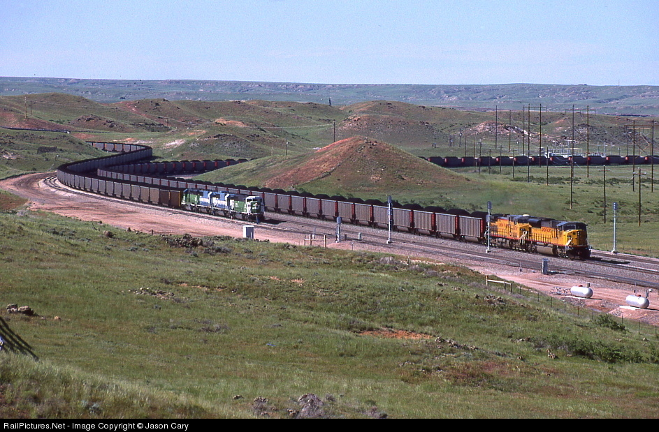 A UP SD9043Mac passes a freshly loaded BN coal train with an SD60M on the point. The grade here is 1% and has been climbing for about a mile a half from Nacco Jct.
