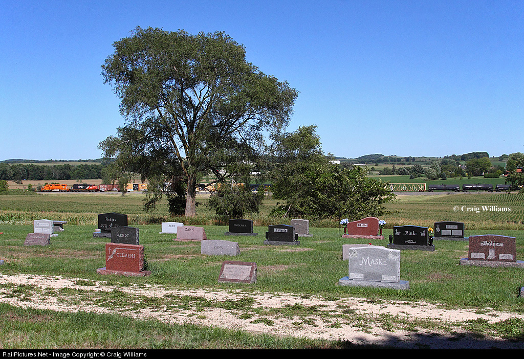 | The Fond Du Lac to Waukesha turn local heads back to Fond Du Lac with 80 cars in tow. Here they past this old cemetery south of Lomira. This job handles the traffic and local work from Lomira to Waukesha. Main stops are at Duplainville, Ackerville, and Waukesha. |