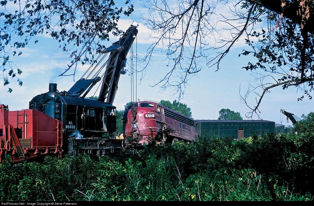 Rock Island's passenger Train 39, formerly called the "Imperial," derailed at Valencia, Ks., 11 miles west of Topeka, and two steam-powered derricks were slowly clearing the double-track mainline on July 20, 1966. Derrick 95020 was lifting FP7 410 back on the rails in the days before Hulcher, R J Corman and other clean-up specialists. Spectators were able to approach only so close.