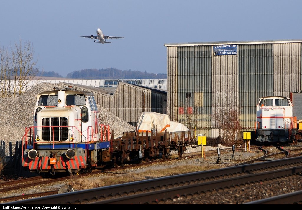 | The Henschel DH 500C 837 801 left together with 847 959 right in front of the engine shop of Sersa Group AG / Switzerland at Rümlang. Behind a Swiss International Airbus 320 taking off from nearby Zurich Airport. |