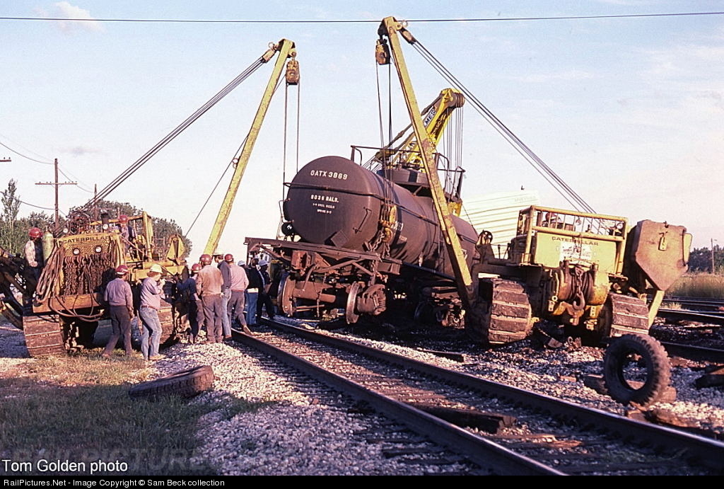 GATX 3869 is seen being rerailed after a derailment on the Conrail/Indiana Harbor Belt mainline just west of Gibson Yard. Tom Golden photo.