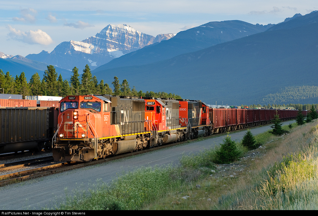 | 103 loads of ballast from the pit at Giscome, BC make their way down Track 1 in Jasper preparing for departure onto the Edson Sub. CN SD75I 5657 and GTW SD40-2s 5937 and 5930 provide the power, and Mount Edith Cavell provides the backdrop! |