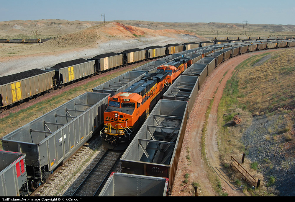 | With a load waiting to leave, BNSF 6267 pulls its empty train into the waiting tracks to be loaded at Antelope Mine. In the distance a Union Pacific load is seen starting up Logan Hill. |