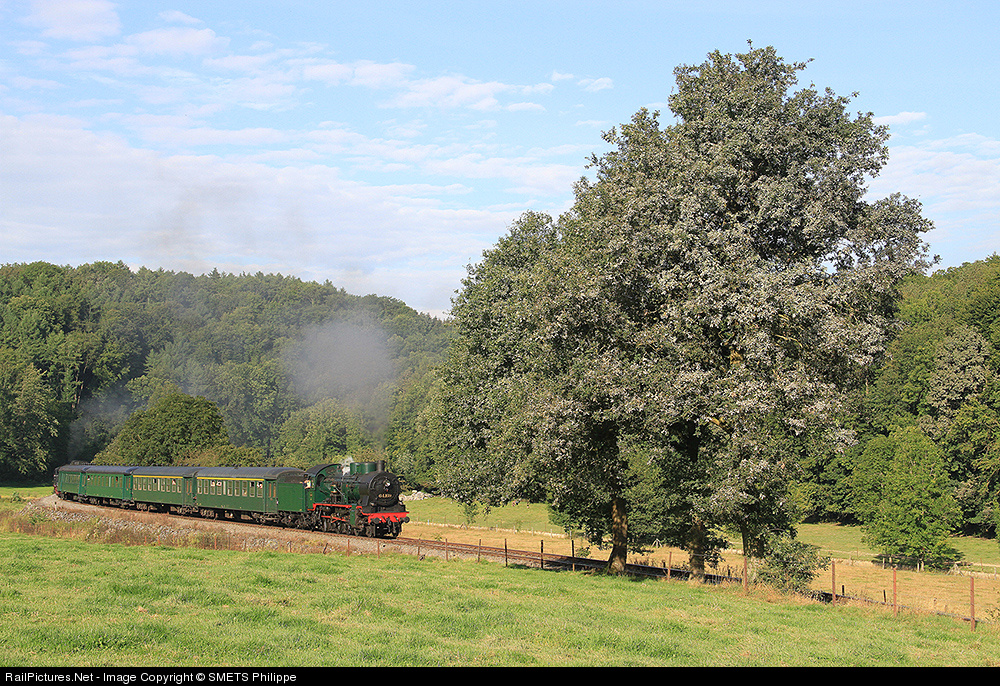 | The "ligne du Bocq" is a heritage line in the heart of the Ardennes in Belgium. It is preserved by the Association "Patrimoine Ferriviaire Touristique". Steam locomotive 64.169 from the Association is pulling a special train with the help of another Steam locomotive 507 preserved by the Association "Train 1900" from Luxembourg, on the former line 128 between Spontin and Ciney. |