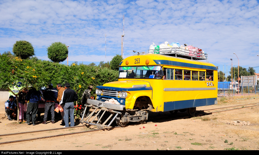 Dodge Ferrobus (railcar) made in 50`s stopped for few minutes at the small village of Cliza on it`s way from Cochabamba city to Aiquile in this funny narrow gauge line. The passengers leaving the bus to buy sandwich, bananas and soft drinks for the long trip during around eight hours.