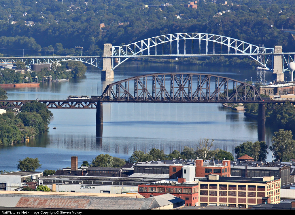 Bluebird on the bridge, NS 1070 rolls across the OC bridge and heads for the mines of the Mon valley.