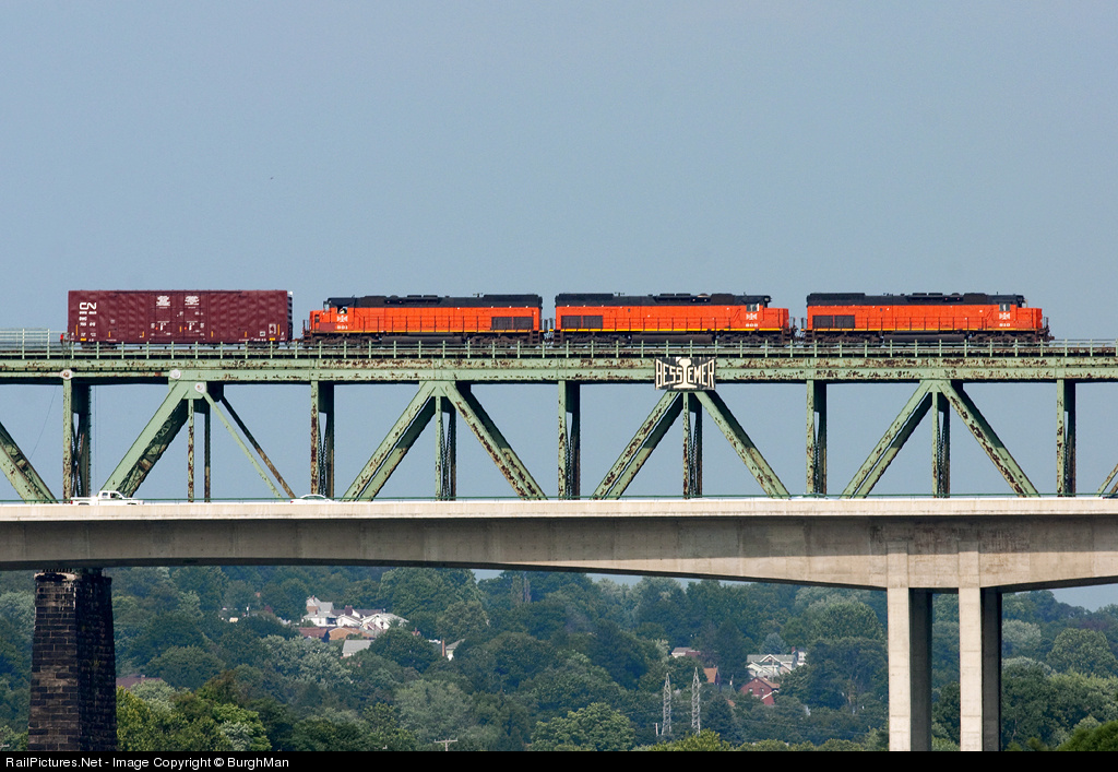 After delivering 76 loads of ore to the Union RR at North Bessemer, three B&LE Tunnelmotors shove a CN Boxcars over the Allegheny River Bridge for the Industrial Track.