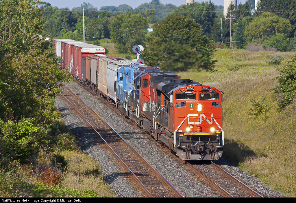 After missing this train by about 15 minutes at Liverpool, a friend and myself jumped on the 401 and headed east to Newtonville, and got set up with only minutes to spare. The consist is 8959, 2669, HLCX 6304, HLCX 6332. The leasers are the first two of five headed to the NBSR.