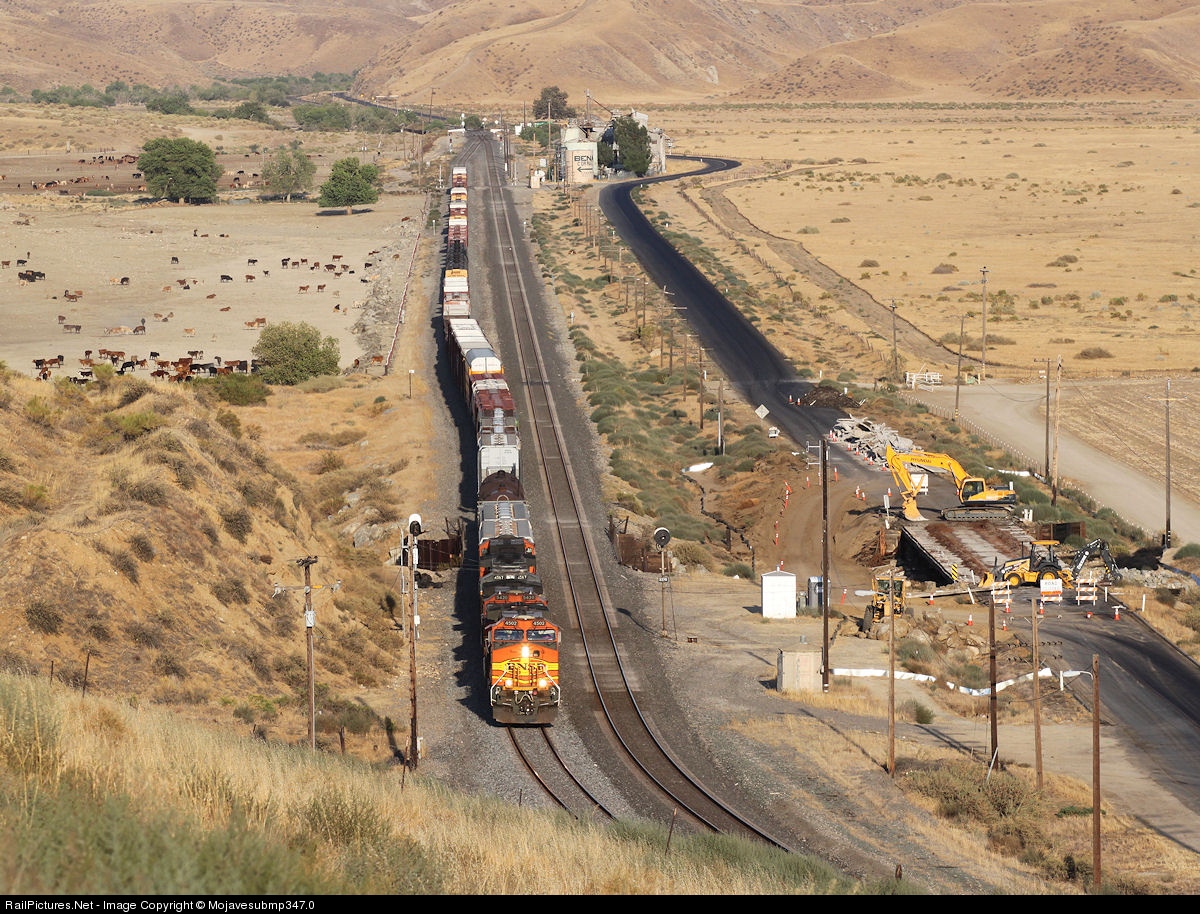 | Looking back towards Bena, this BNSF Northbound is leaving the Tehachapi's behind as it races towards Bakersfield. Note the bridge replacement on Bena road to the right of the photo. |
