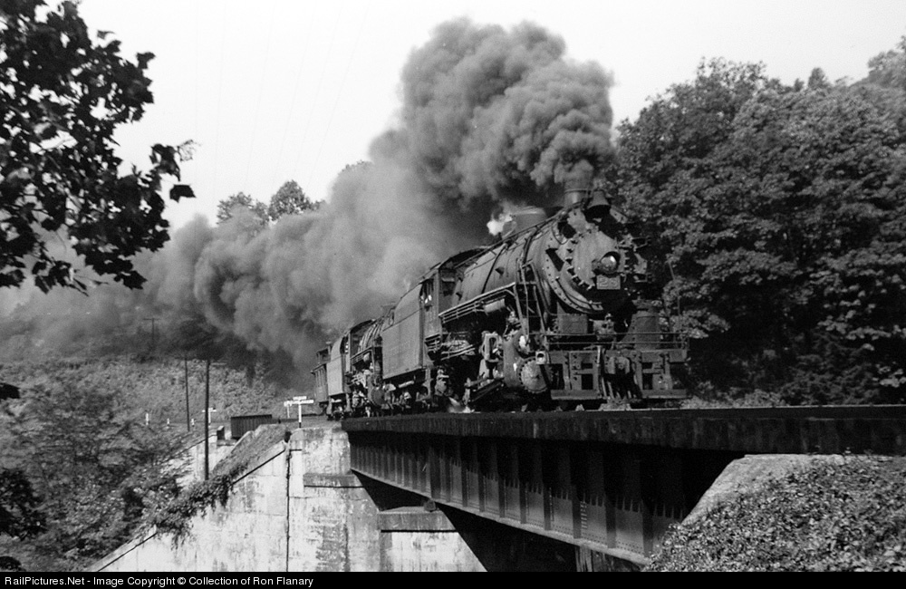 Virginia coal-hauling short line Interstate purchased four ex-Southern Ks-3 Consolidations in July 1952--the last steam acquisitions by the company. Former Southern 2509--now Interstate's 28--leads a sister on a cab hop at the bridges over the L&N and Powell River just east of Appalachia. The doubleheader is likely a "Hill" crew, which will pull L&N interchange traffic from the connection at Dorchester Junction, and take it over to Miller Yard for interchange to the Clinchfield. The ex-Southern engines were out of service by late 1953, and officially retired and scrapped in 1955--replaced by orange, cream and gray Alco RS-3s. (Photo by D. Wallace Johnson)