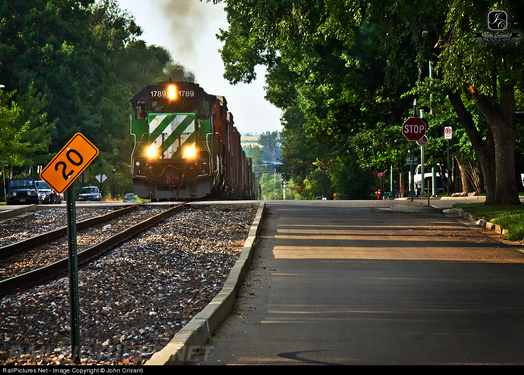| Minus the BNSF renumbering, this was a common scene back in the BN Days during the 90s before the merger. Seen here, the Longmont Switch notches up leaving Longmont going up the middle of Atwood Street with 27 cars. |