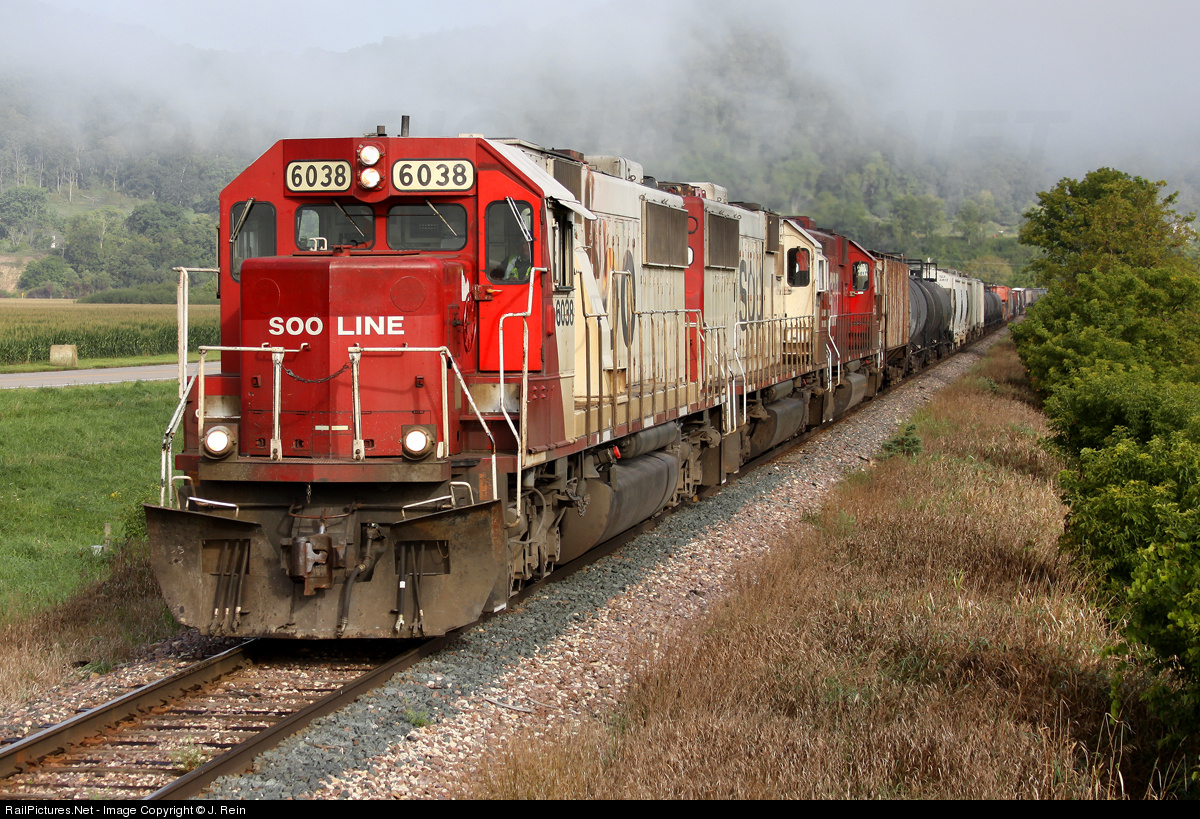 | SOO 6038 slices through the fog just south of New Ablin Iowa. This consist was like a throwback to the 90s when SOO SD60s were king on the Marquette Sub. Now after a few changes in hand, SOO SD60s can be seen working this line once again looking a little worse for wear since the last time they were here. |
