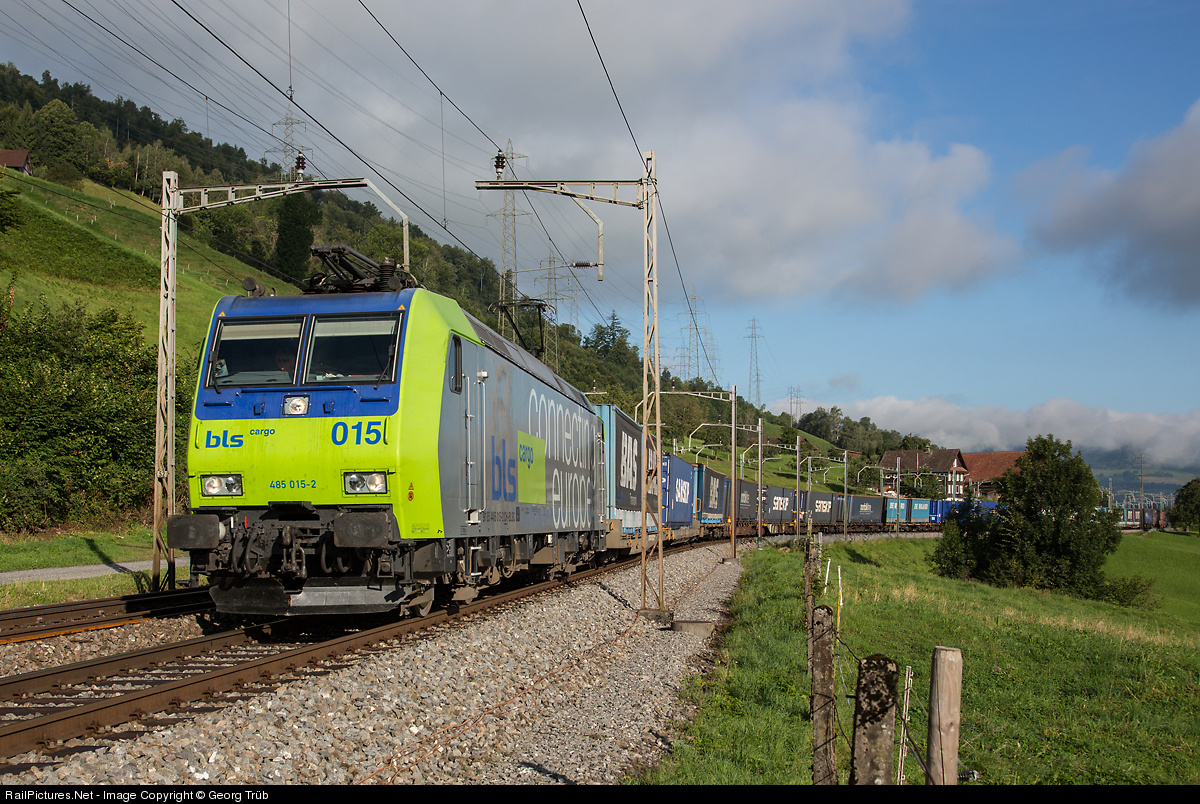 | Re 485 015 of the BLS with train 40039 Rotterdam Waalhavn - Gallarate (Busto Arsizio) of Hupac near Immensee. In Erstfeld probably a red 185 of DB Schenker will be coupled in multiple for the Gotthard ramp. |