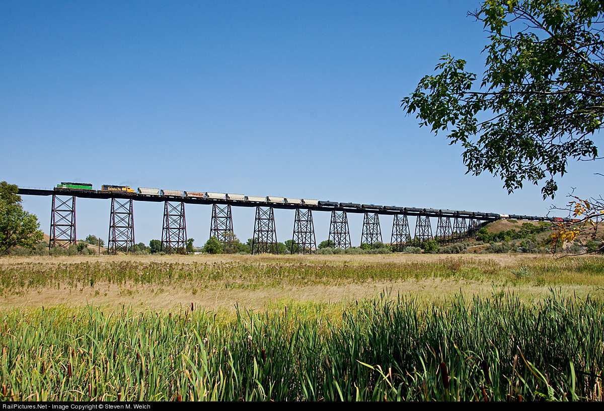 Two of BNSF's workhorse SD40-2's crawl up the .65% grade leading an 8400 ton Ross Turn over the 1822 foot long Gassman Coulee Trestle on a fine Summer afternoon. You can imagine what it sounded like, while were making 8MPH!