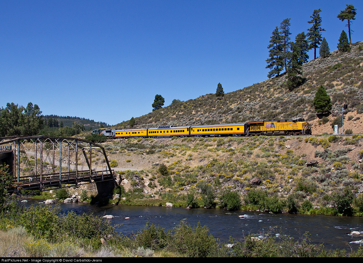 | A UP special runs employee's family's between Truckee and Sparks throughout the day. UP 7771 passes Boca on its first trip east as it fallows the Truckee River down the hill. |