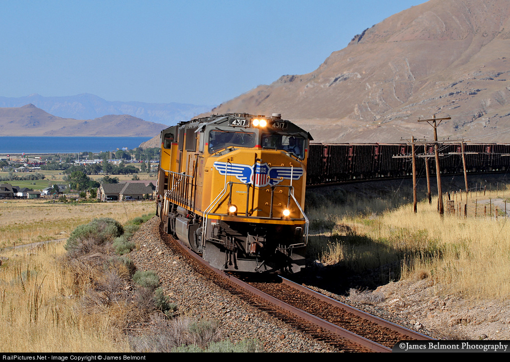 A unit train of Herzog ballast empties heads west for reloading at Murdock, Utah. The town of Lake Point, Antelope Island, the Great Salt Lake, and Mount Ben Lomond are all visible from this northerly perspective along the historic LA&SL Route in Tooele Valley.