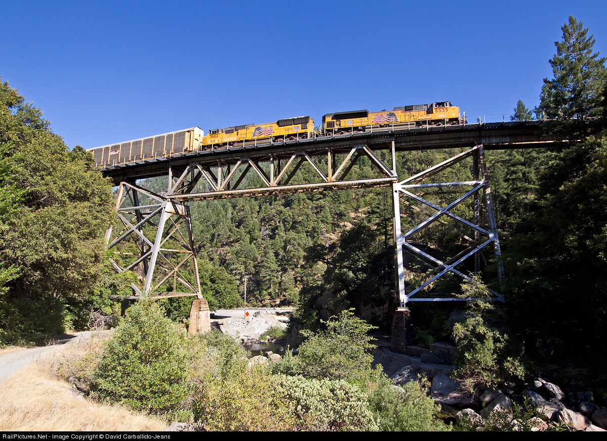 UP 8535 glides through the Feather River Canyon as it goes over the trestle at Rock Creek.