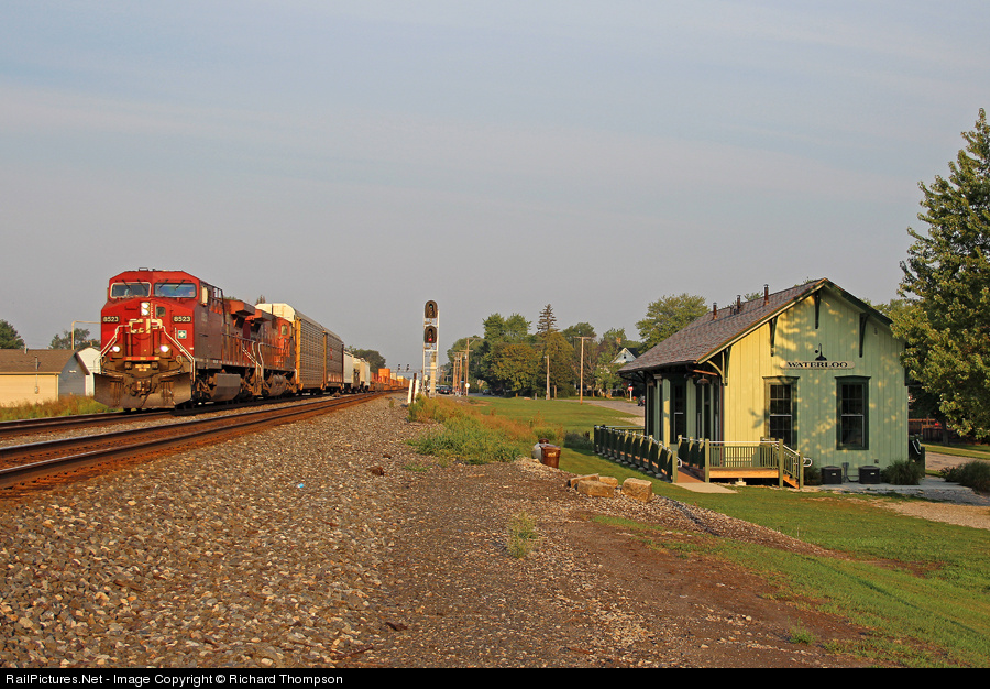 | One of the daily CP run-through trains rumbles by the Waterloo depot, quickly approaching the connection at Butler where it will swing onto the ex-Wabash and head towards Detroit. |
