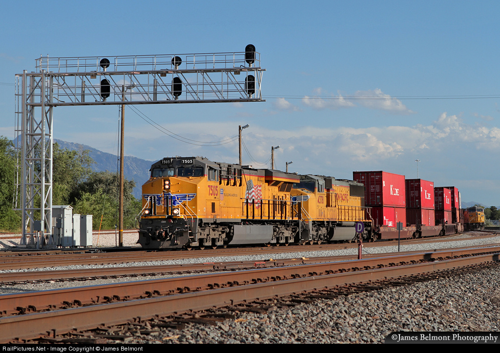 While a grain empty waits its turn to depart on Main Track One, UP's KTSLN4 stack train knocks down the signal at CP C785 on Main Track Two at North Yard in Salt Lake City. This K-Line stack train will be interchanged with the Norfolk Southern in Chicago, IL.