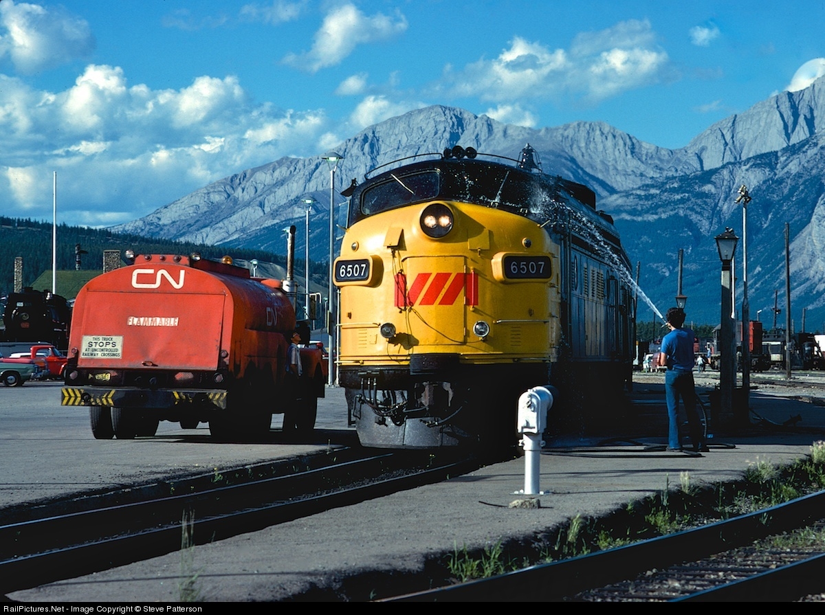 During the stop at Jasper, former CN FP9 6507, carrying some of the first ditch lights applied in North America, gets its windshield washed and its fuel tank filled before proceeding on west to Vancouver. The CN 4-8-4 at far left has observed the ritual for years.