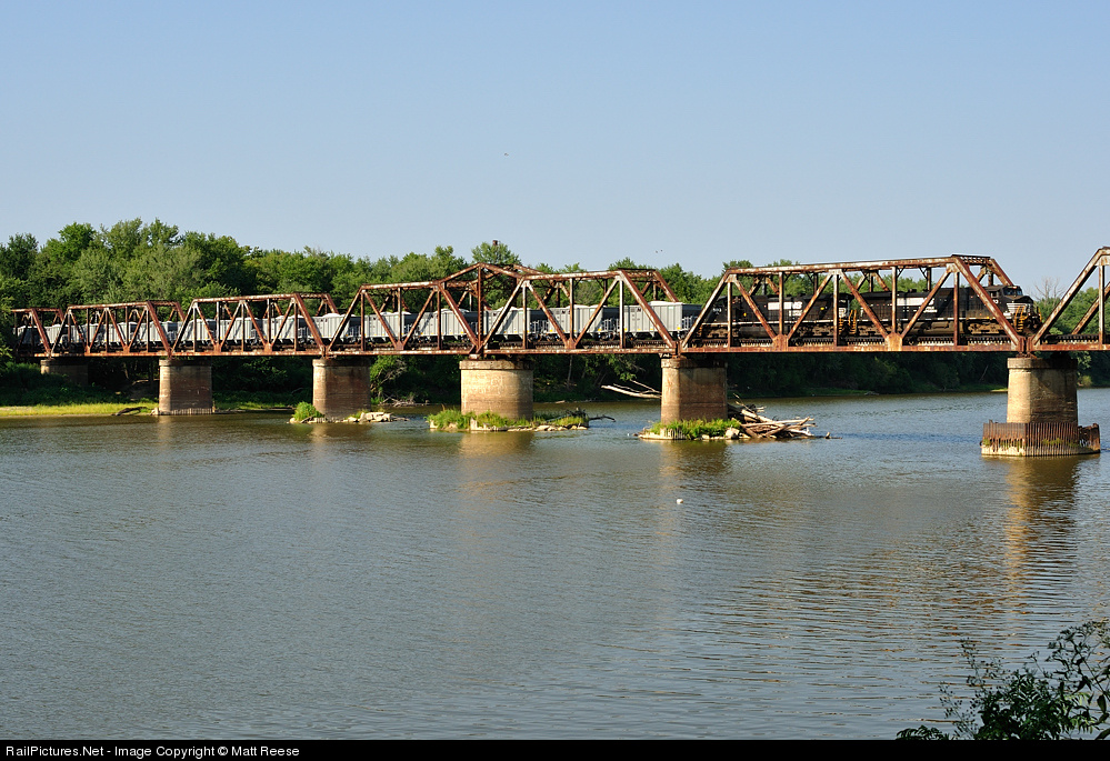 Led by two Dash-9s, NS Train #375 rumbles across the old Big Four's Wabash River bridge at Carol, IN, with 20 loaded limestone cars. Constructed by a subsidary of the Cleveland, Cincinnati, Chicago and St. Louis Railway circa 1910 as part of the branch between Mt. Carmel, IL, and Evansville, IN, the Warren Truss bridge now serves Norfolk Southern carrying unit coal and limestone trains bound for Duke Energy's Gibson Generating station.