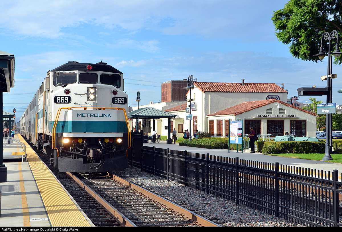 On a hot, muggy August 28th, 2012, Metrolink train 604, heading from Los Angeles to Oceanside, departs Orange, California, 17 minutes late due equipment problems (doors that became inoperable) on train 640, which preceeded it. In the background is the former Santa Fe station on the east side of the mainline, which was converted to a restaurant years ago, and is now thriving as a part of the Ruby's Diner chain. The interior is nicely decorated in a railroad theme (mainly, but not exclusively, Santa Fe), including some elements copied from Los Angeles' Union Station. And there is a patio for trackside dining as well.