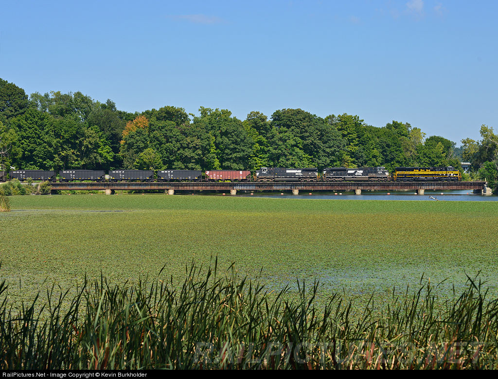 Norfolk Southern's Nickel Plate Heritage ES44AC 8100 made the foray onto Pan Am trackage on September 1, leading a pair of NS black units on the NHB-46 coal train for Bow, New Hampshire, seen at Fisherman's Lane in Schagticoke, NY.