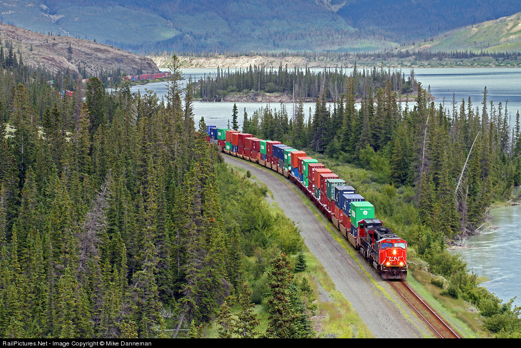 Canadian National intermodal train No. 105 heads west at Windy Point, which is near Snaring, Alberta, on July 19, 2011. This scenic location is along Jasper Lake in Jasper National Park.