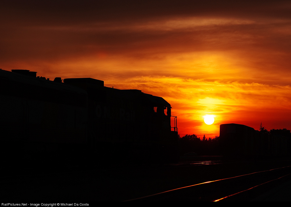 Northern Ontario sunset, ONR 121 arrived into Cochrane 15 minutes ago and is now backing into the yard to be tied up and service for the night for tomorrows run south as 122 to Toronto.