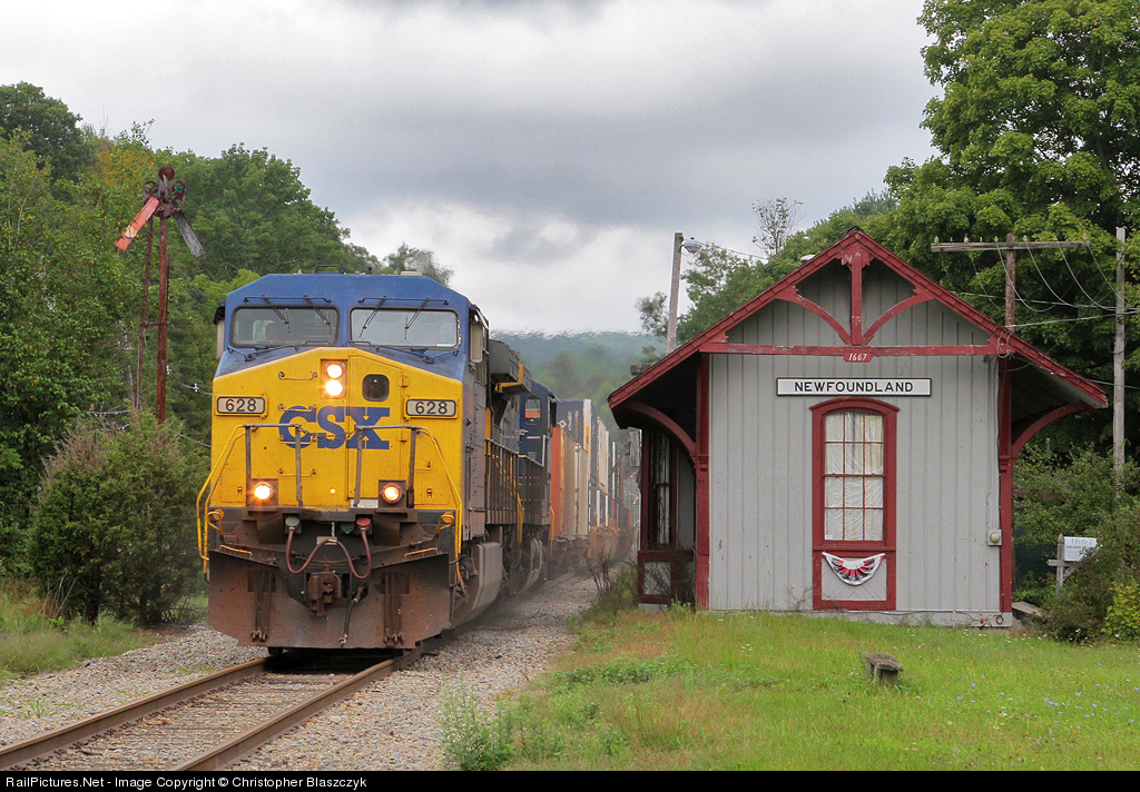 DETOUR. With the Mohawk River bridge replacement shutting down CSX's mainline west of Selkirk, NY for 48 hours, CSX decided to detour three eastbound intermodals down the New York, Susquehanna & Western from Syracuse, NY to North Bergen, NJ. The second of the three detours, Q156, is seen kicking up dust as it passes the depot at Newfoundland with CSXT 628 and 487 as power.