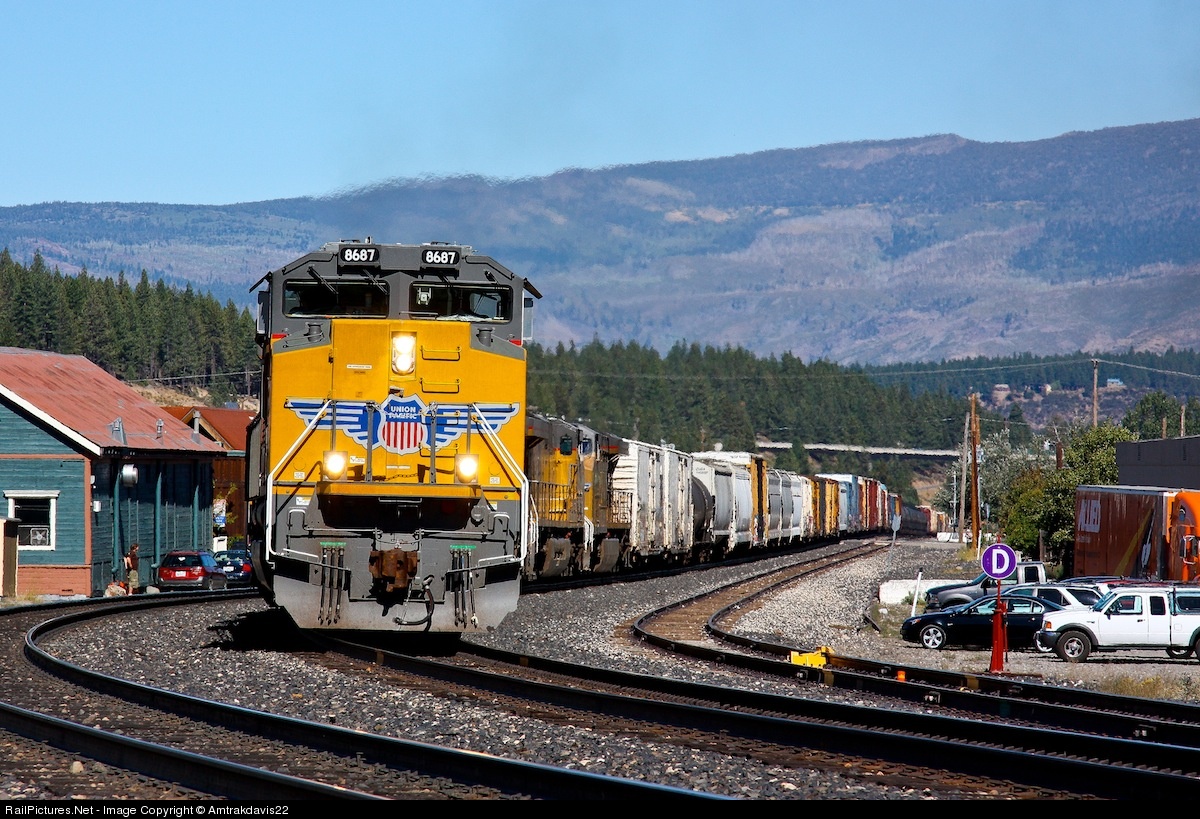 | The piece of the small mountain town of Truckee, California is broken by Union Pacific 8687 as it blasts through downtown on it's way west down the Donner Pass Route. |