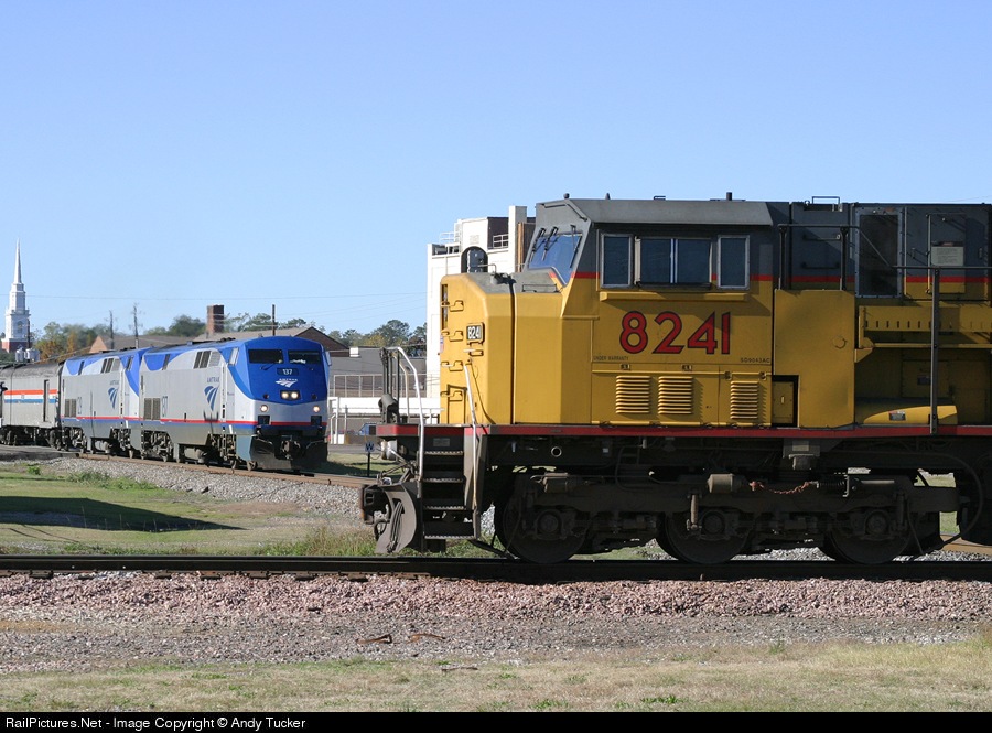 UP 8241 is the DPU on an empty CN coal train that has Amtrak's train #20 with P42's 137 and 129 blocked at the interlocker in Hattiesburg, MS.
