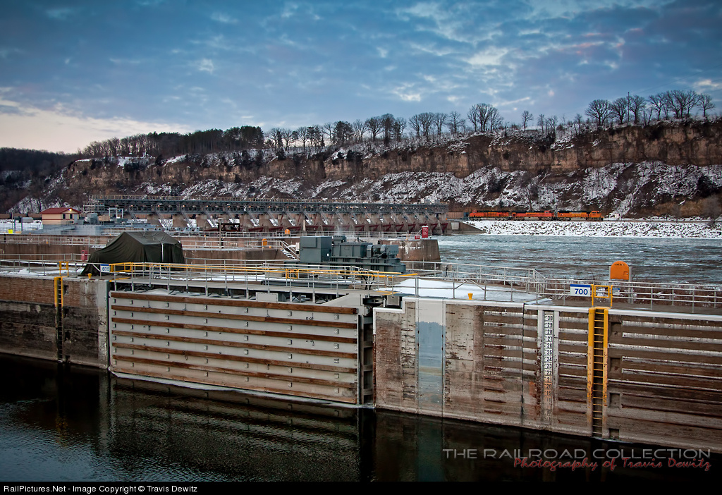 BNSF 9843 leads a coal train out of St. Paul, Minnesota down a very cold and ice covered Mississippi River past Lock and Dam #2 near Hastings. Lock and Dam #2 was built original built in 1907. Following construction, the original lock walls settled and began to lean out of alignment, so a replacement lock was built. It was finished in 1948. A rehabilitation phase ran from 1987 to 1995. In 2009, Lock and Dam No. 2 became home to the nation's first commercial, Federally-licensed hydrokinetic power facility, which is a partnership between the City of Hastings and Hydro Green Energy, LLC of Westmont, IL.