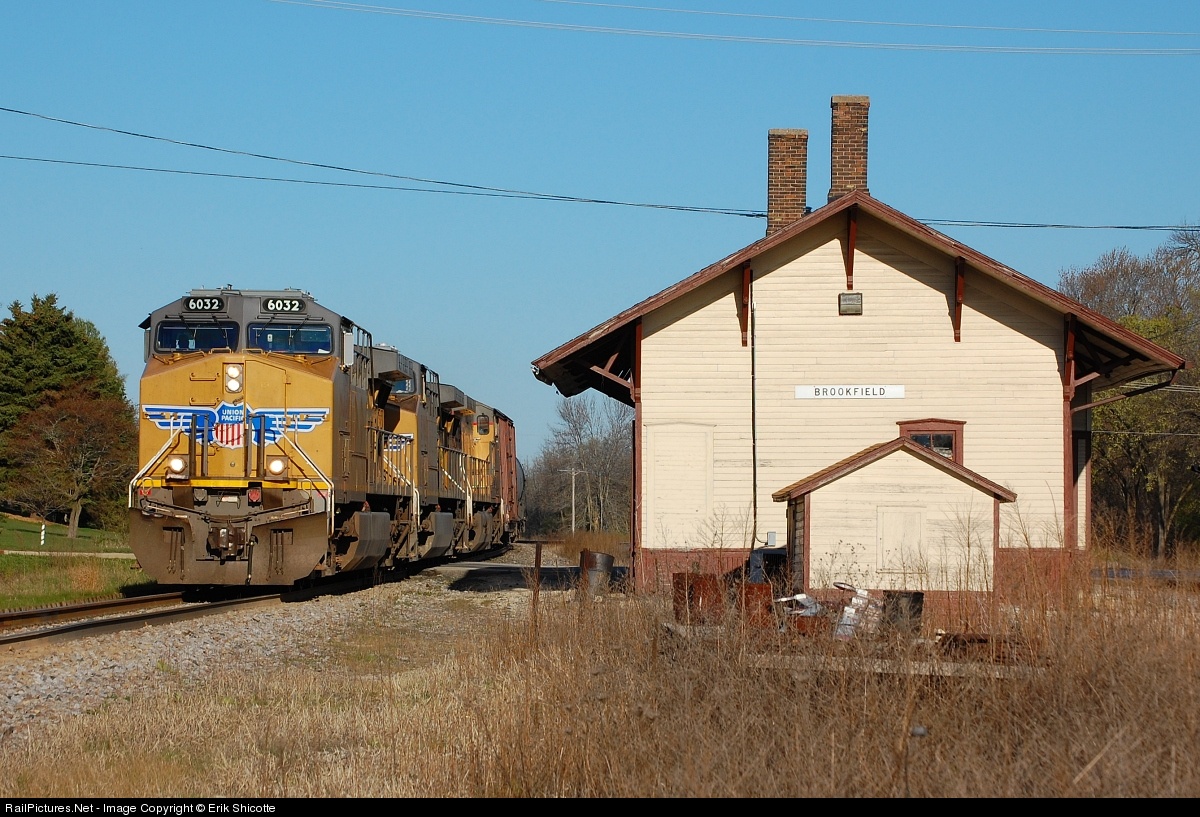 A Union Pacific led tank train rolls by the historic Brookfield Depot.