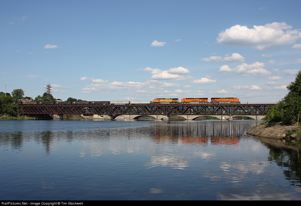 | A trio of BNSF units leads a loaded sludge train across the Mohawk River at Cohoes, NY as it heads south for the D&H's Kenwood Yard in Albany. The train is carrying sludge from the Hudson River dredging project at Fort Edward and is ultimately bound for Texas. |