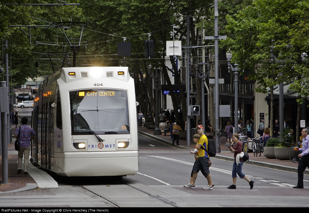 | An inbound Yellow Line train makes it's stop at Pioneer Place/SW 5th Avenue in the Transit Mall, while pedestrians make their way across the street. The Downtown Transit Mall is on 5th (Southbound) and 6th (Northbound) Avenues, where the right 2 lanes are reserved for buses and light rail trains only. |