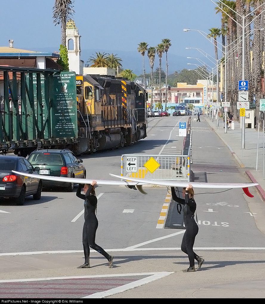 Steps off the beach, these surfers encounter a rumbling Davenport Local returning to Watsonville junction.