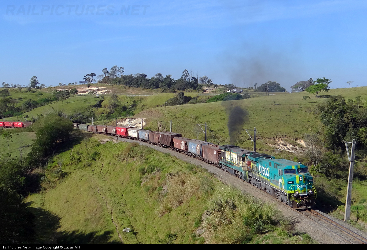 | Southbound grain train, at region of Itu. The Brado units are the most difficult locomotives to photograph at ALL system, since they operate only two units, with this unique paint scheme. |