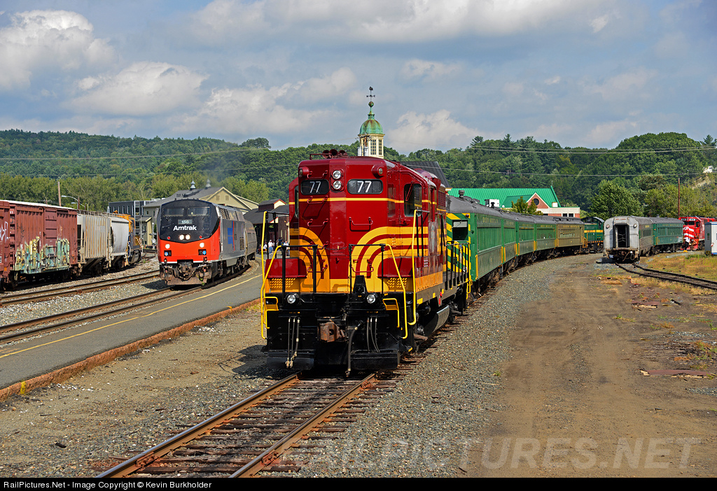 In a special gathering, for which I wish to thank Amtrak, Pan Am, Vermont Rail System, Montreal Maine & Atlantic and the New England Central for working with me to make happen, Amtrak's Vermonter train #57 heads southbound through White River Junction, VT, passing the NECR 601 freight, the Pan Am Boston & Maine heritage GP9 (ST) #77 with the GMRC White River Flyer passenger train and GMRC Alco RS-1 405 and distantly more VRS power on hand. The gathering was arranged by Eastern Railroad News for the Glory Days of the Railroad Festival in White River Junction, VT.